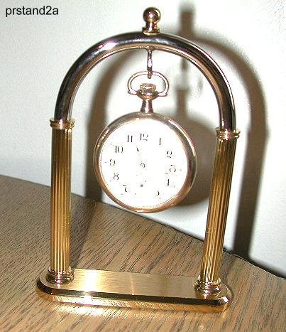 Classy looking 5" tall brass display for your favorite pocket watch. Top arch is chrome, and the bottom is brass -- very nice looking. Show off your best timepiece!!